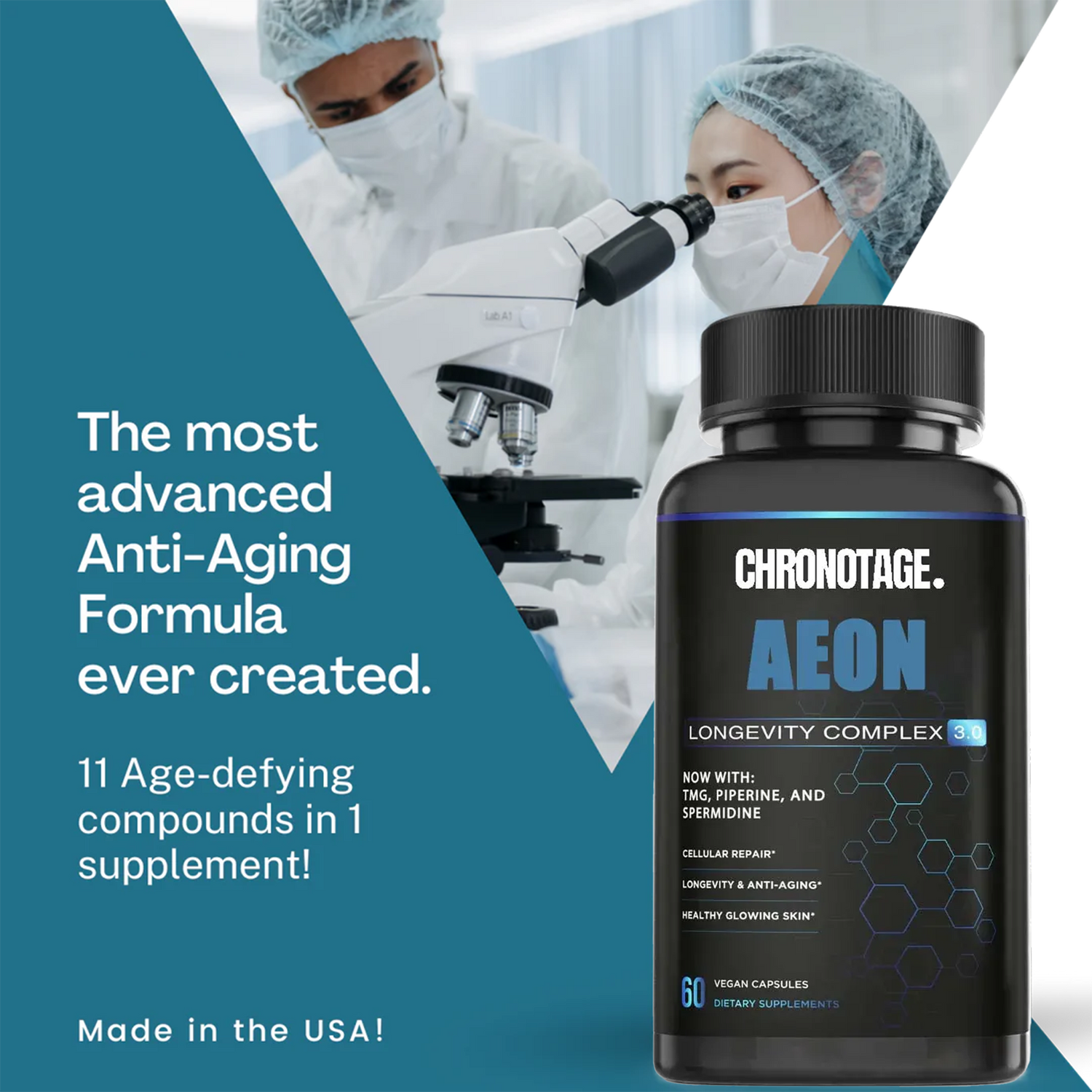 Don’t settle for a single ingredient to support healthy aging. AEON™ is the only product to offer an 11-compound longevity complex that addresses everything from oxidative stress, glycation, telomere shortening, to side reactions, and mutations [*].New studies show each of these compounds when taken daily extend life in mice & primates up to 30% [*]. Promising studies in humans are currently underway.Furthermore, a synergistic effect happens when they're compounded that has been associated with a reduced risk of all-cause mortality, diabetes, stroke, and heart-disease-related death [*].Below we'll break down the origin, and effects of each ingredient in AEON™ with links to independent, peer-reviewed studies.